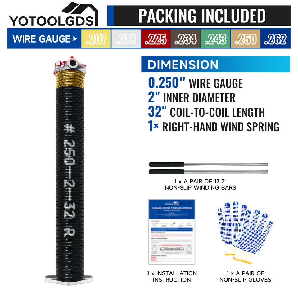 0.250X2"X32"-R High Precision Right Hand Wind Garage Door Torsion Spring (Red Cone) with Non-Slip Winding Bars & Gloves