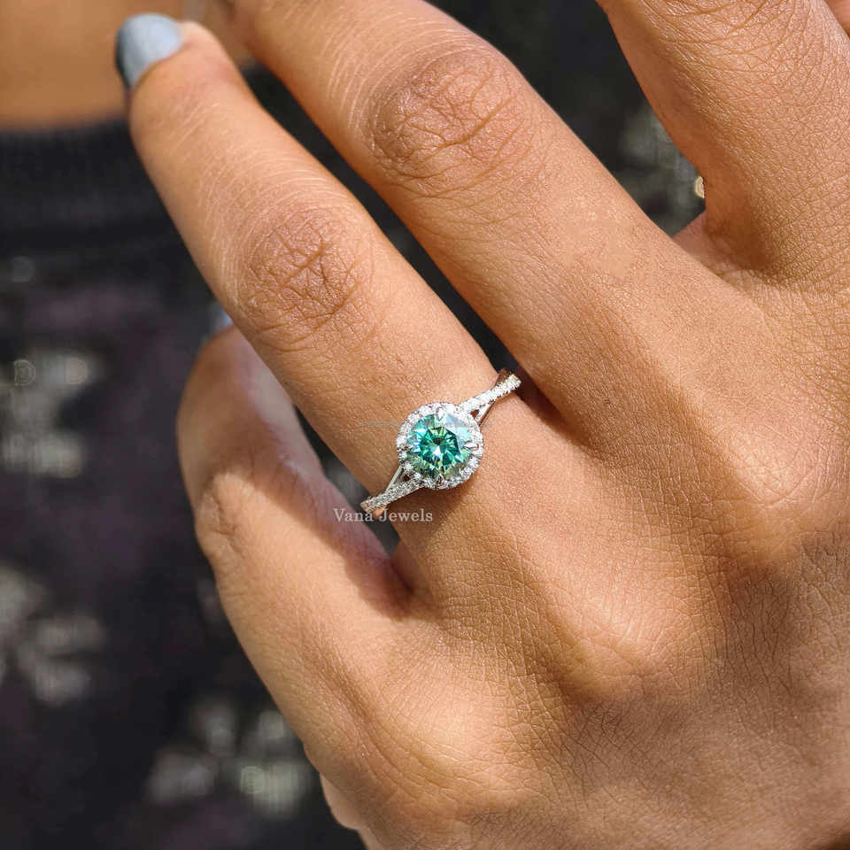 1.06 Carat Round Cut Cyan Blue Moissanite Halo Engagement Ring 18K White Gold Twisted Pave Setting Wedding Anniversary Jewelry