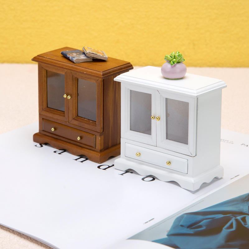 1:12 Scale Miniature Food Play Dollhouse with European Furniture DIY Wood Model Cabinet and Double-Door Bookcase OB11 Style
