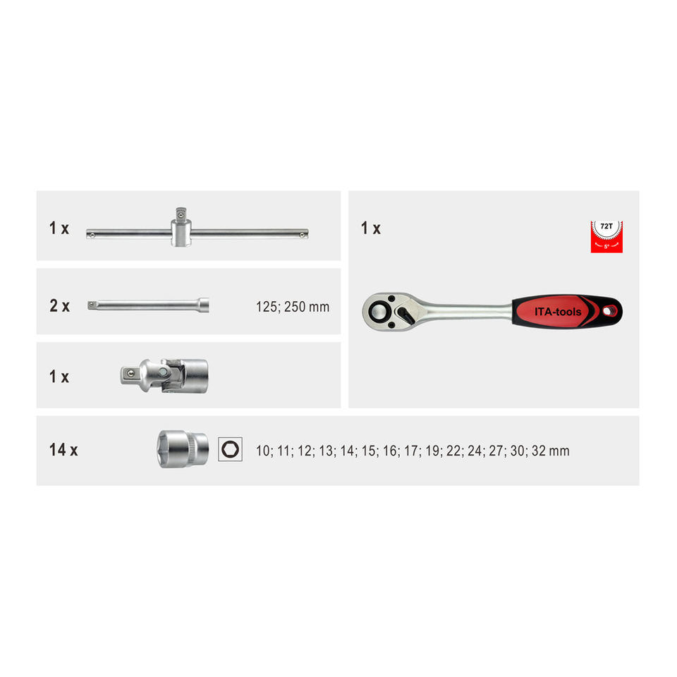 extension bar, ratchet handle, Socket, Universal Joint, Sliding T-Handletool includes