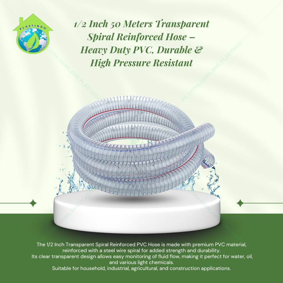 1/2 Inch Clear PVC Reinforced Hose Steel Wire 50 Meter High Temperature & Chemical Resistant Gardening Industrial & Chemical Use