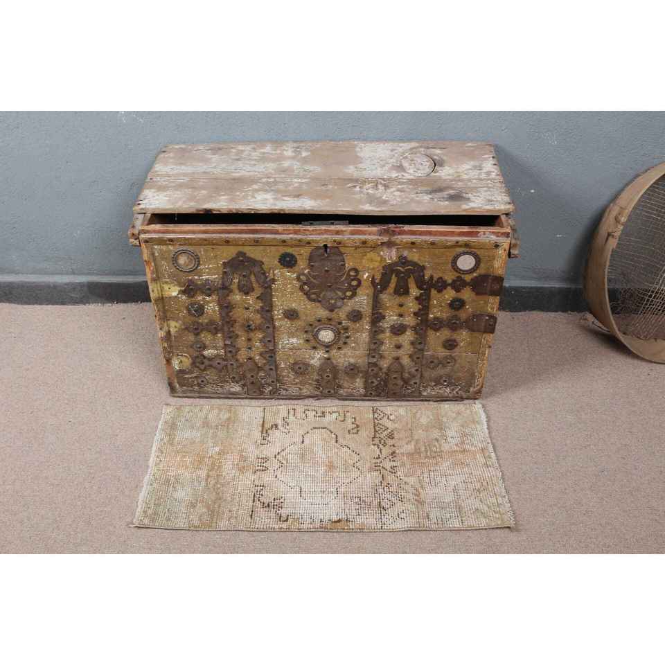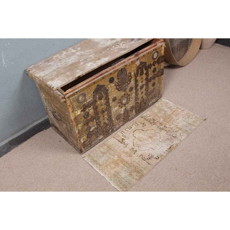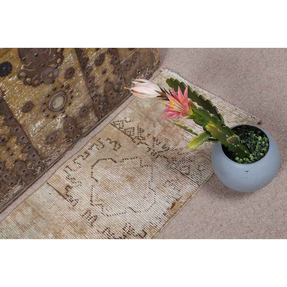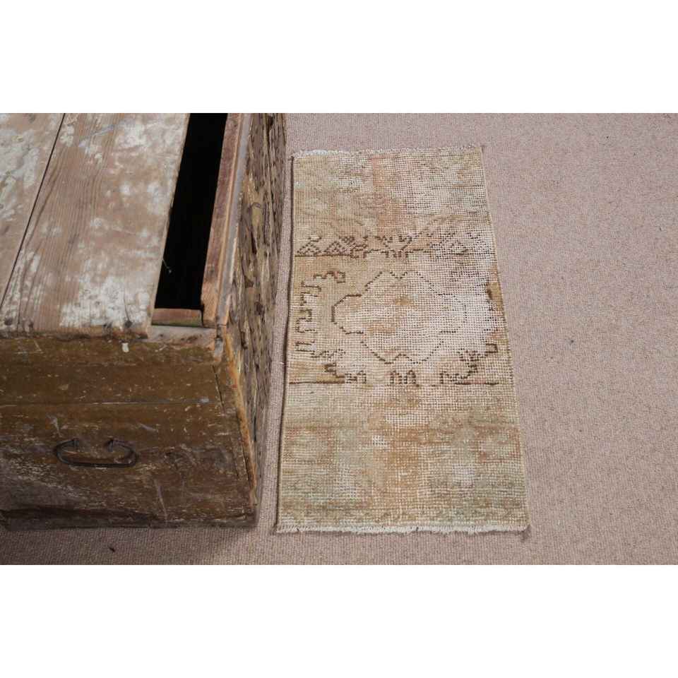 1.2x2.6 ft Rug, Turkish Vintage Rug, Brown Beige Check Wool Rug