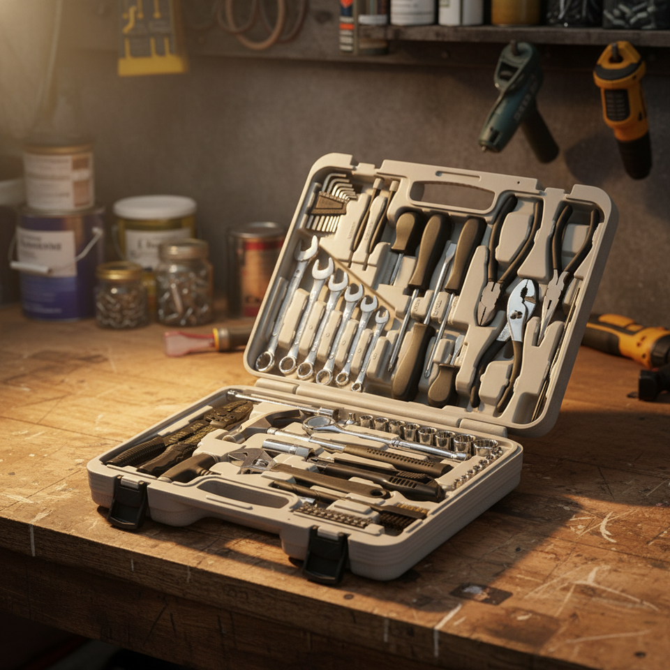 hex keys, Screwdriver, Pliers, Adapters, extension bar, ratchet handle, universal joints, Bristle Brush, wrench, Socket, T head, knife, bits, half-round type file, crimping tool, terminal casetool includes