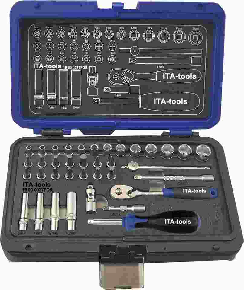 bit socket, extension bar, ratchet handle, Socket, Deep Socket, Universal Joint, Sliding T-Handle, Spinner Handletool includes