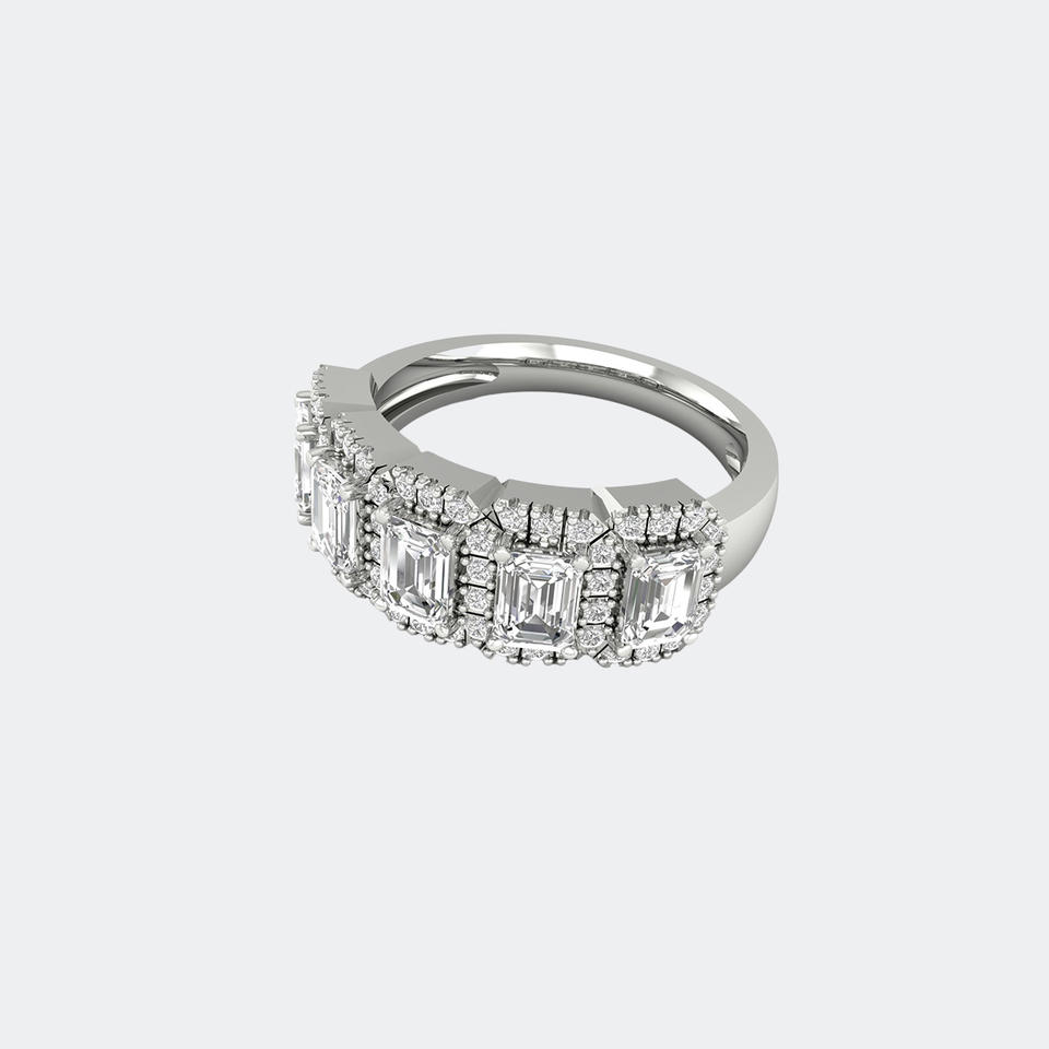 1.80CTW Emerald & Round Diamond Five Stone Halo Ring 14k Gold Lab Grown D Color Pave Set Statement Band for Women