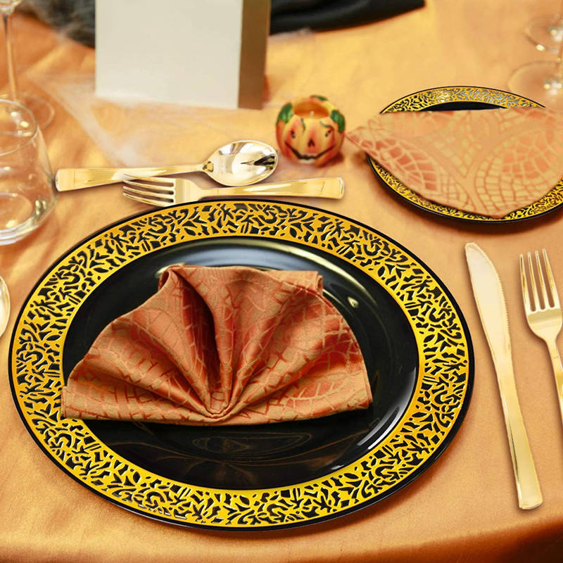 10.25 Inch Heavy Duty Wedding Black Disposable Plastic Dinner Plates With Gold Lace Design for Party