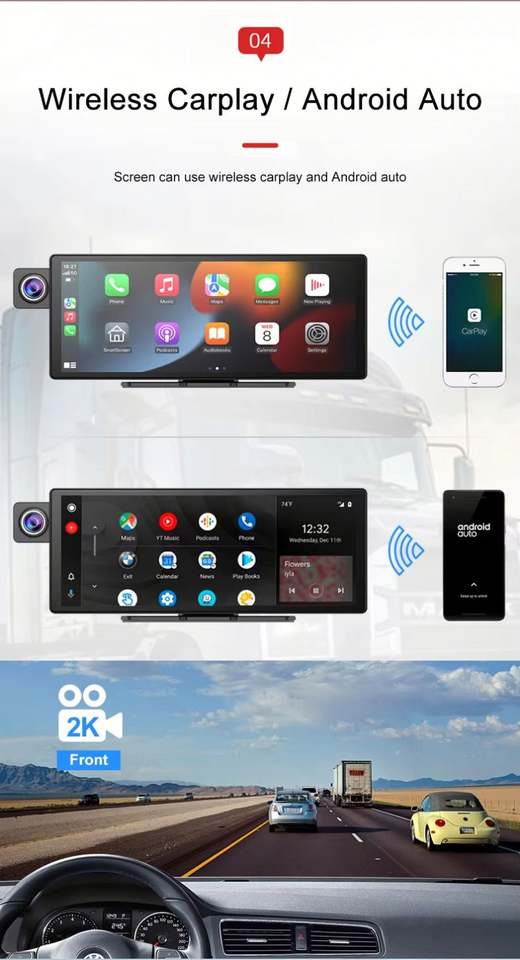10.26 Inch Large Wireless Carplay Touch Screen Android Auto IPS Cars 3 Cameras 2K+1080+1080 DVR Built-In GPS DSP RGB TPMS