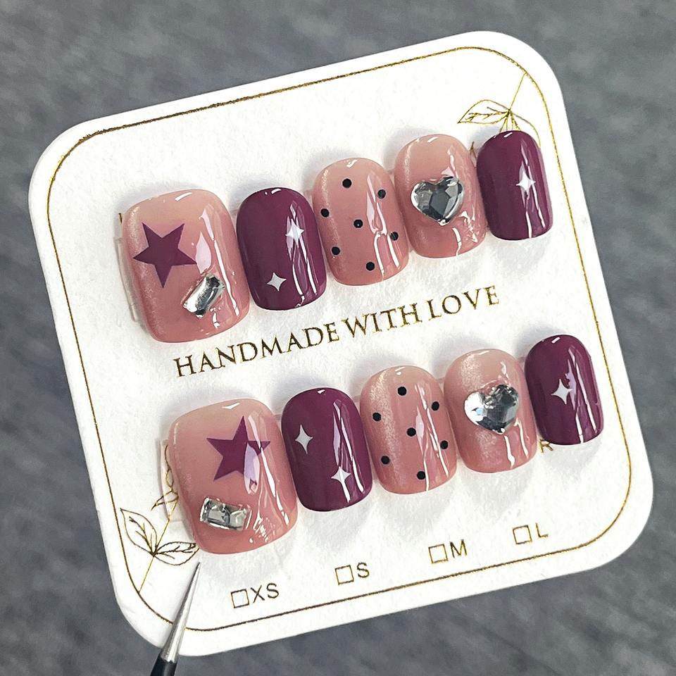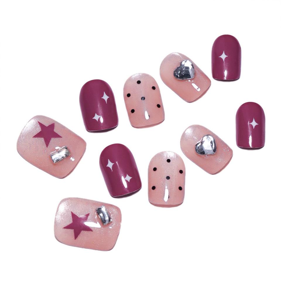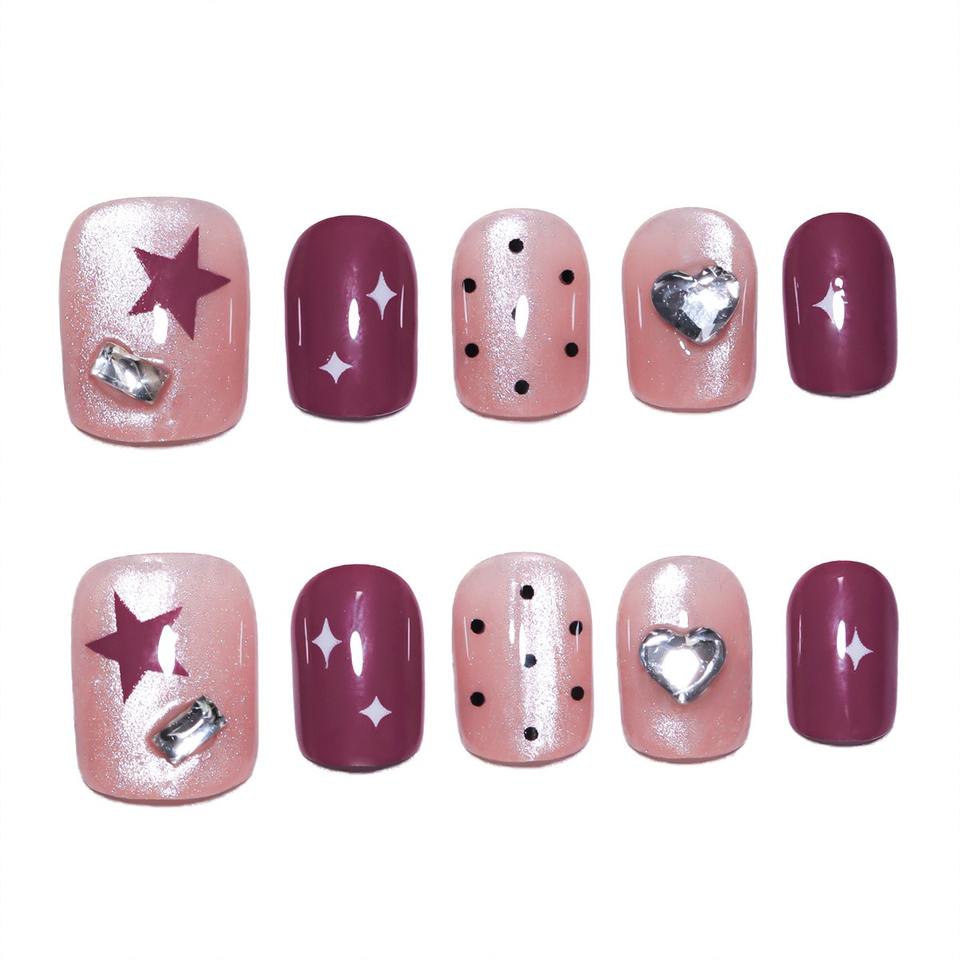 10 Pcs/set Nude Pink Cat Eye Star Heart Dotted Crystal Black Polka Dot Acrylic Pre-designed Glue Almond Shape Finger Nail Art