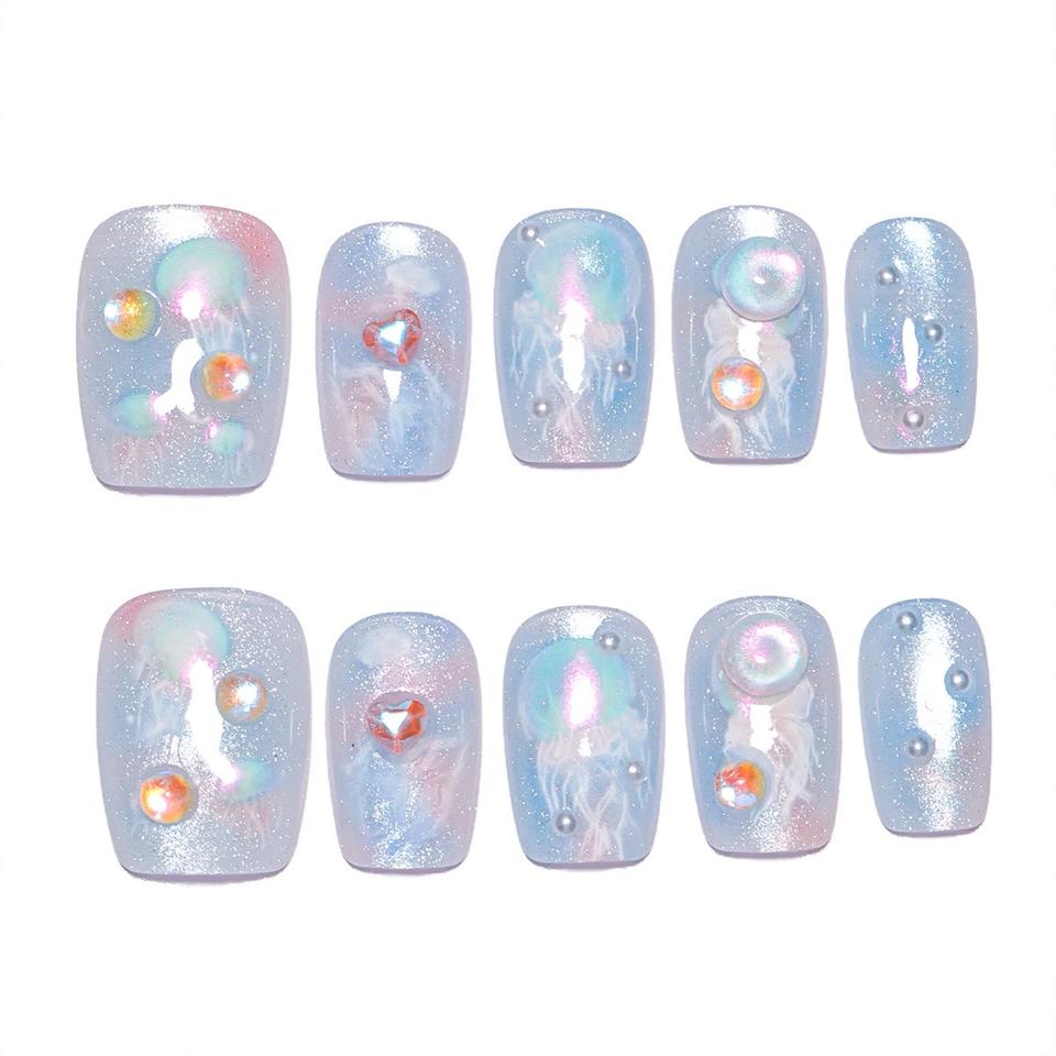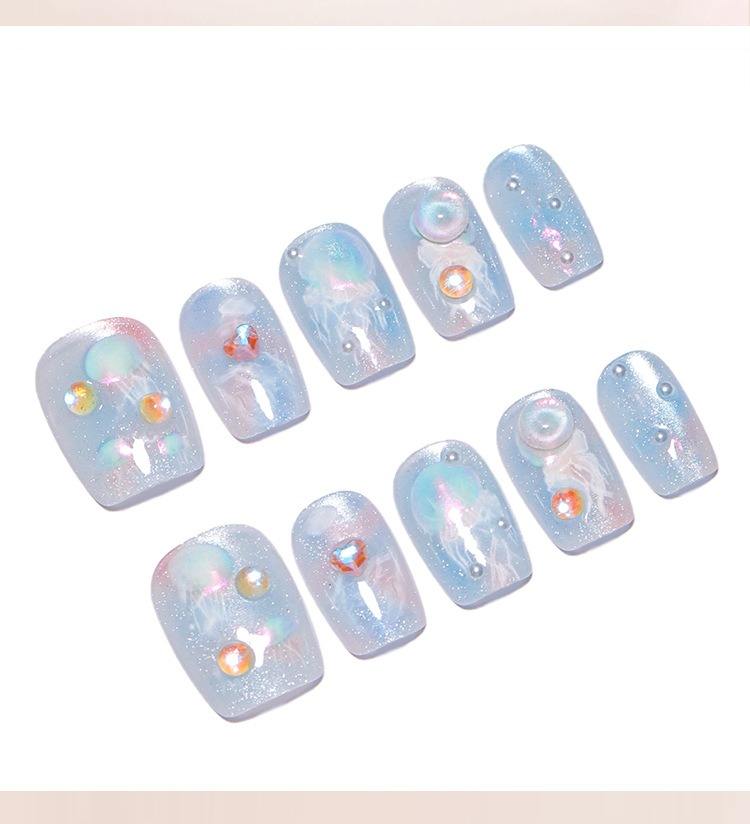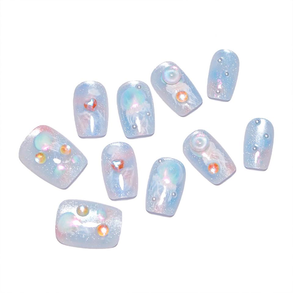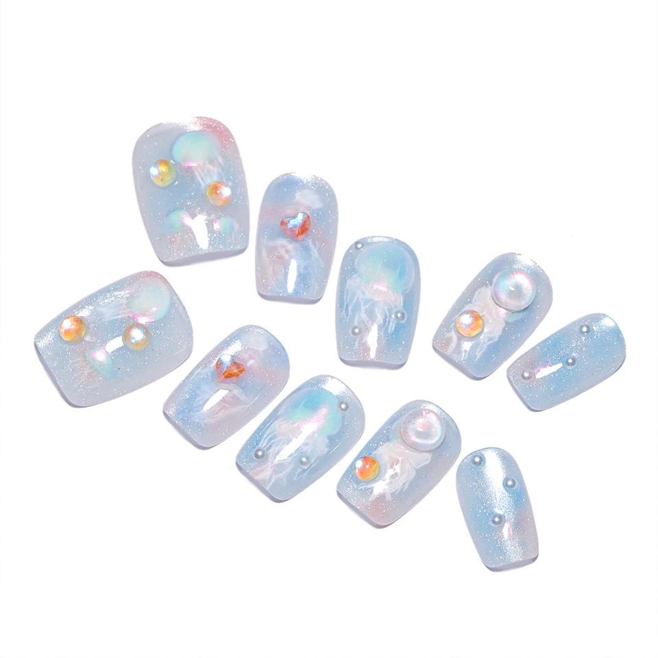 10 Pcs/set Ocean Blue Gradient Cat Eye Bubble Bead Acrylic Pre-designed Glue Almond Shape Nail Art Tips Press Nails Artificial