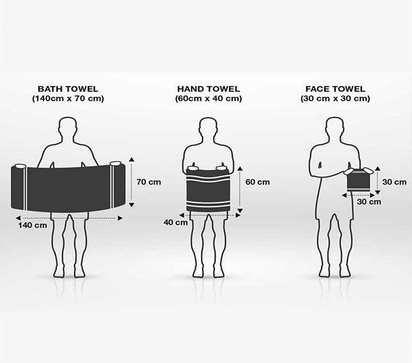 Sizes:Bath (140cm x 70 cm), Hand (60cm x 40 cm), Face (30cm x 30 cm)
