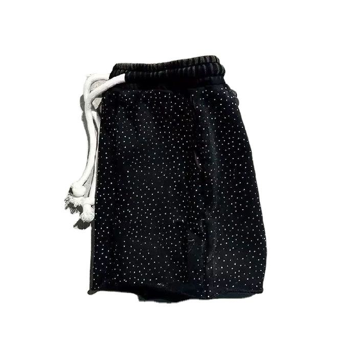 100% Cotton Hip Hop Board Shorts Custom Embroidered Allover Rhinestone Logo Mid Waist Casual Summer Wear Rope Drawstring OEM ODM