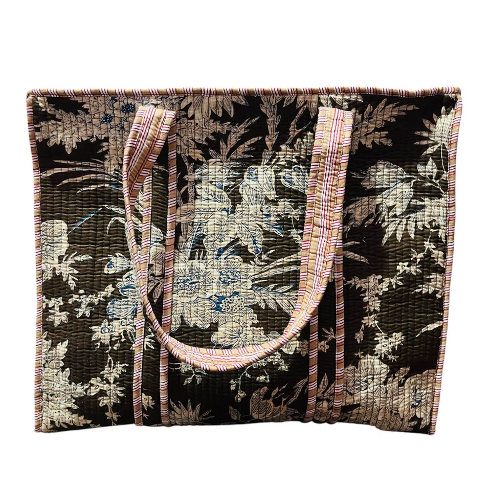 100% Cotton Brown Floral Handblock Printed Cotton Quilted Shoulder Tote Bag with Zipper