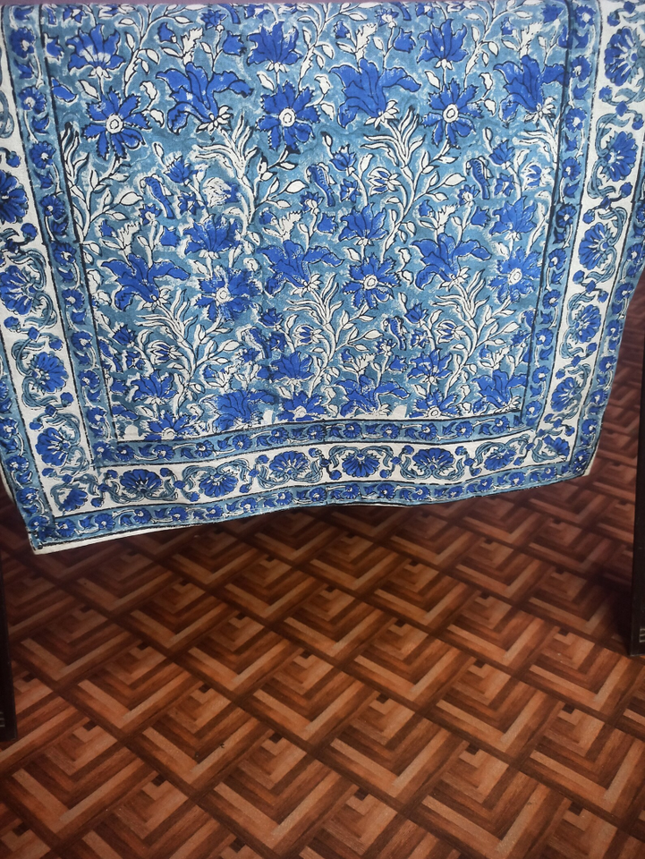100% Cotton Creation Turquoise Sky Blue & Blue On White Floral Printed Cotton Cloth Table Runners with Border Design Table Cloth