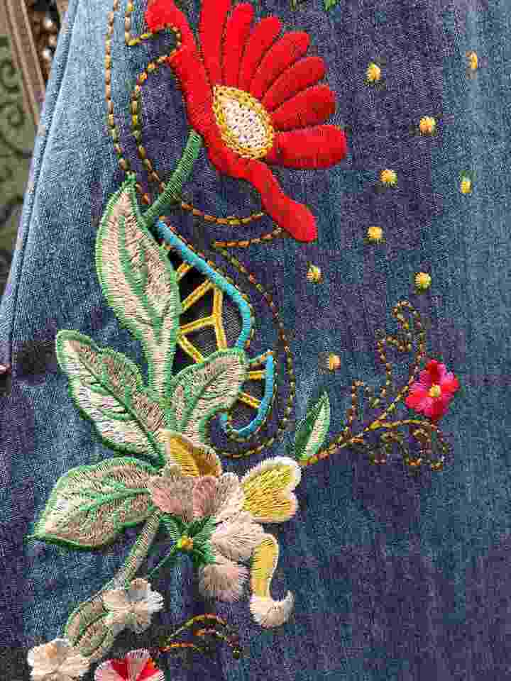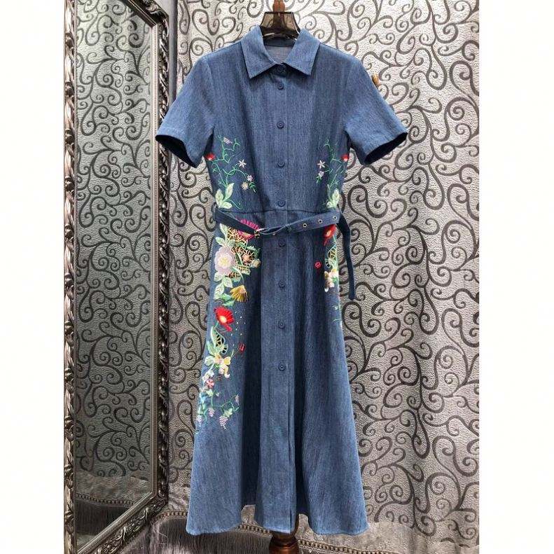 100%Cotton Denim Dress 2025 Autumn Women Turn-down Collar Colorful Floral Embroidery Patterns Mid-Calf Blue Jeans Dress Gorgeous