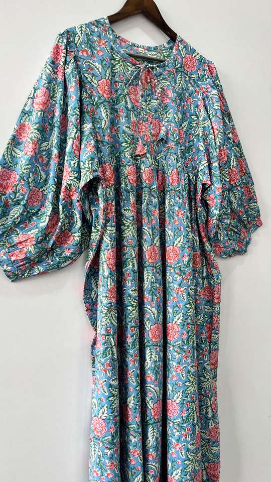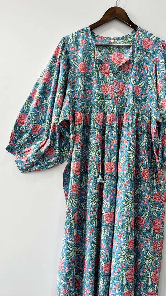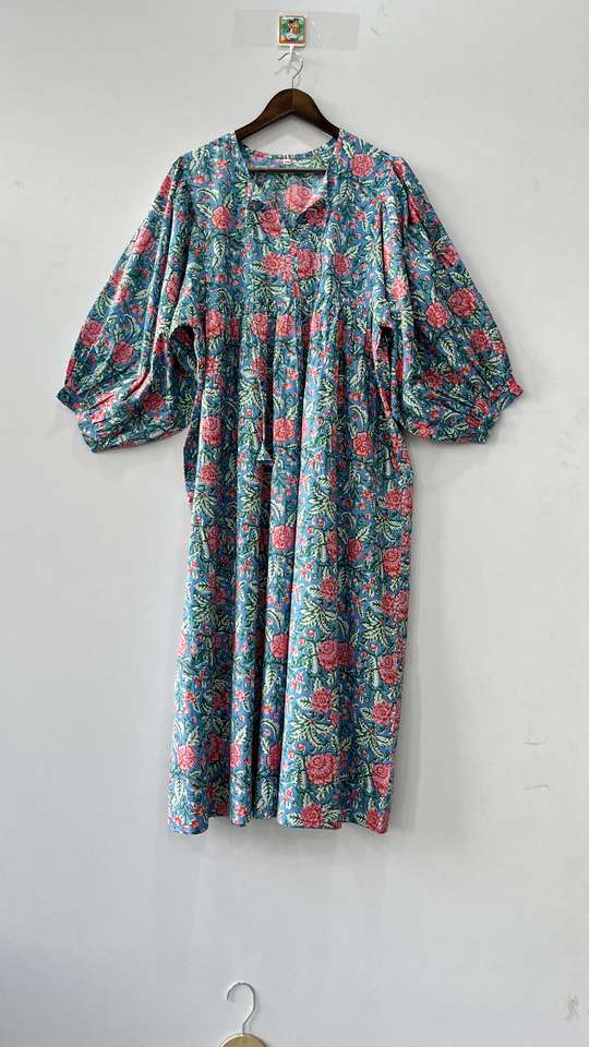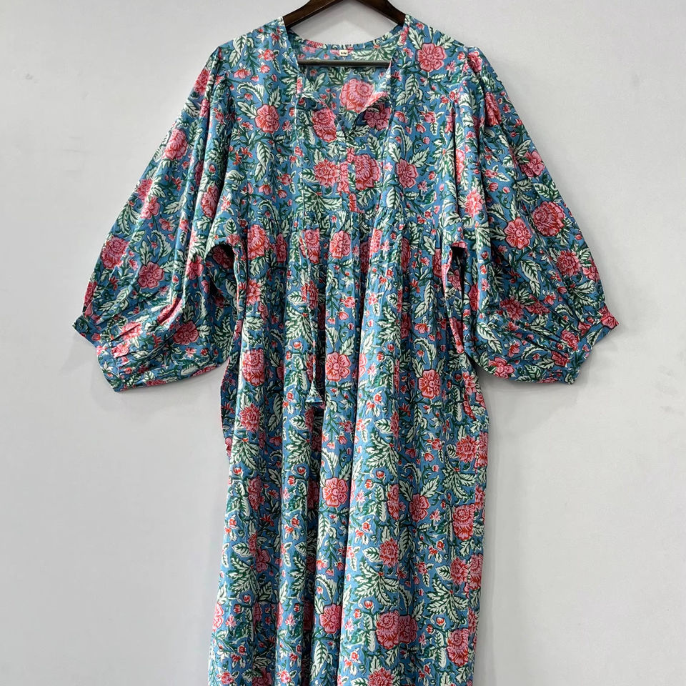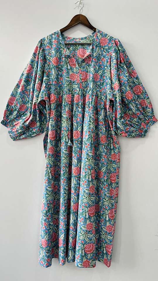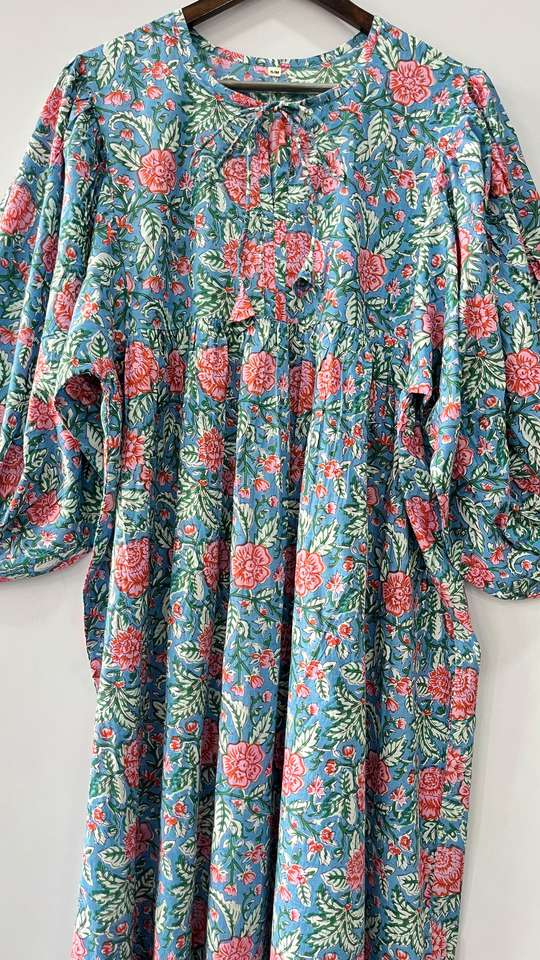 100% Cotton Floral Hand Block Print Midi Dress Woven with Digital Printing Soft Breathable Deep Neck String Closer for Summer