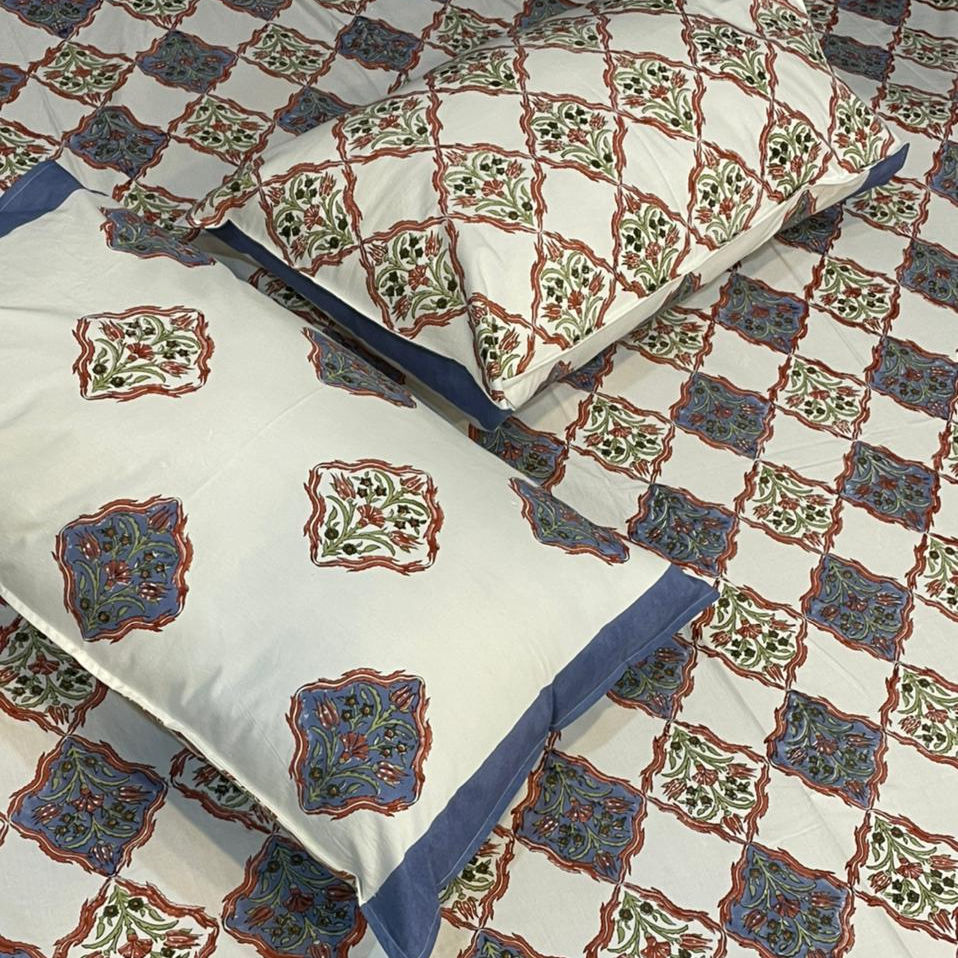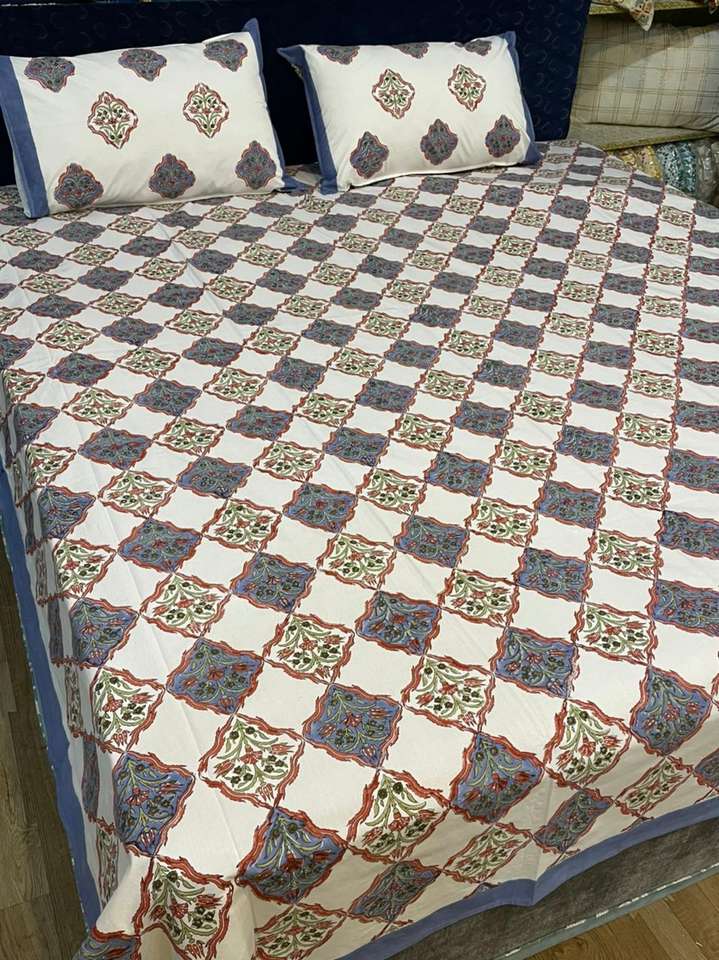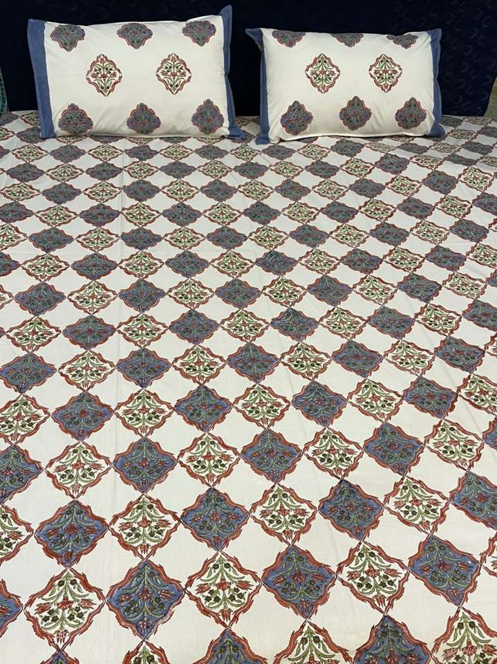 100% Cotton Hand Block Printed Indian Jaipuri Blue Color Bedsheet with Two Pillow Cover Bedding Set for Home