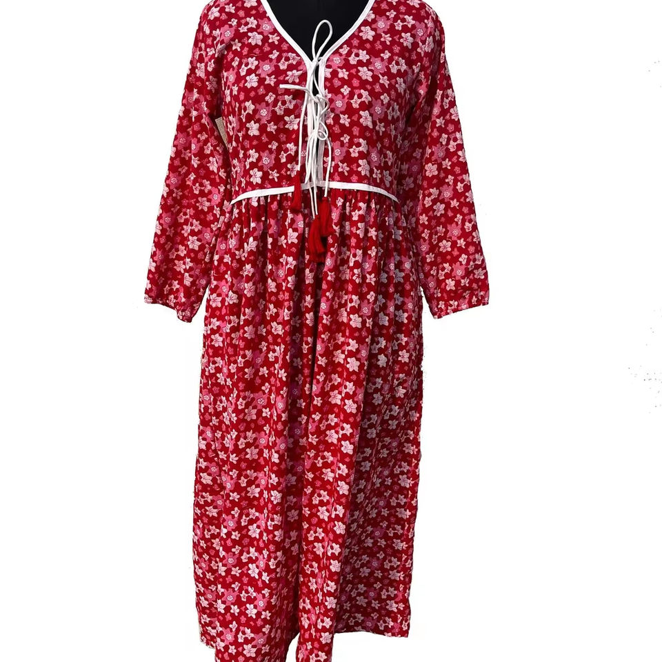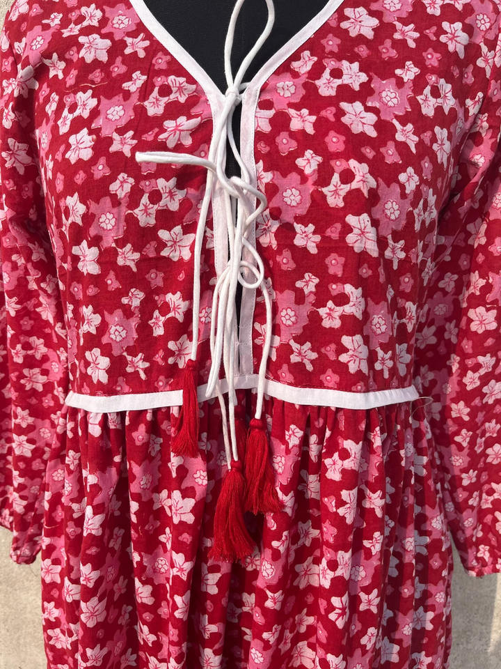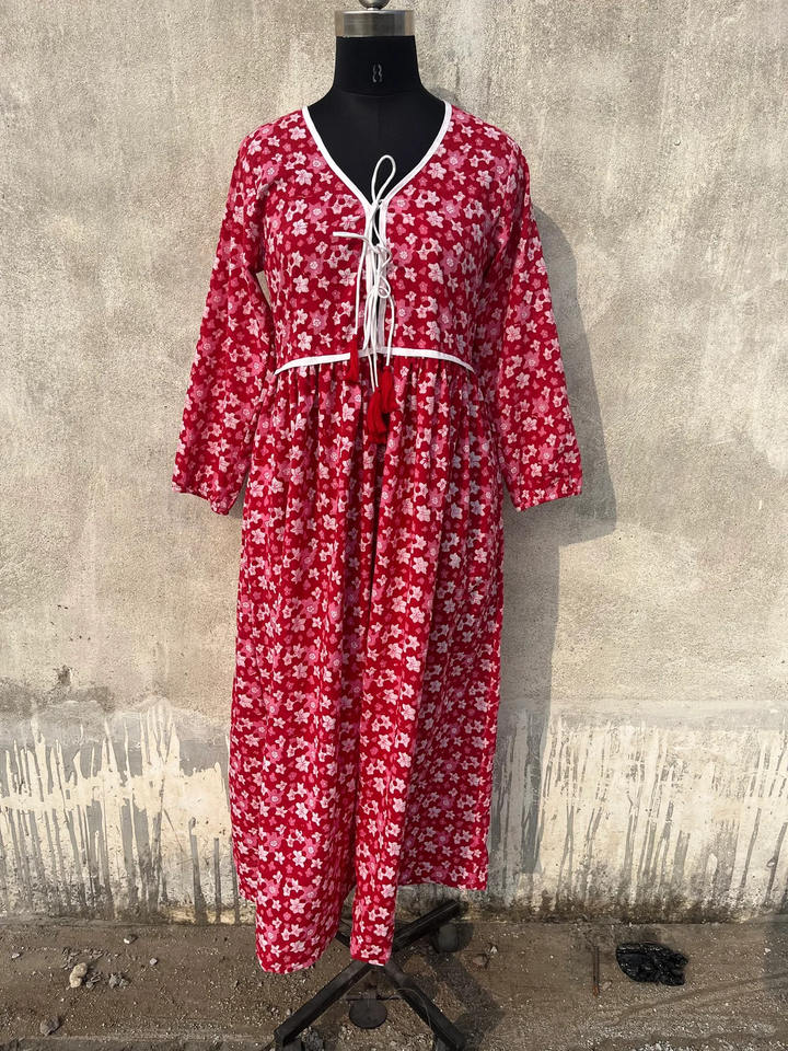 100% Cotton Hand Block Printed Maxi Dress Indian Casual Style Long Gown with Embroidered Tassels