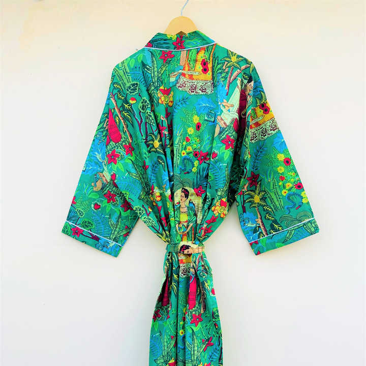 Women's Kimono Style Kantha Cotton Animal Print Handmade Oversized Summer Boho Maxi Gown Bathrobe Casual Dresses Wholesale