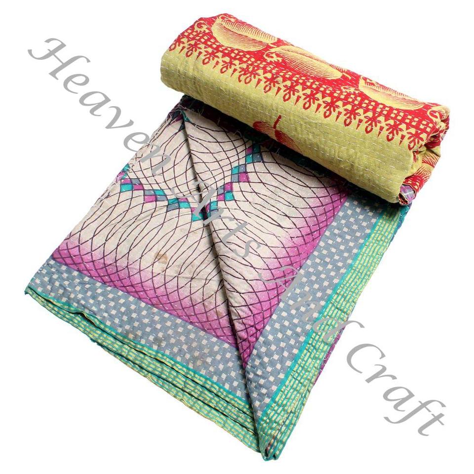 100% Cotton Indian Cloth Throw Hand Block Print Kantha Quilt Indian Reversible Hand Stitched Heavy Throw Old Sari Blanket Patch