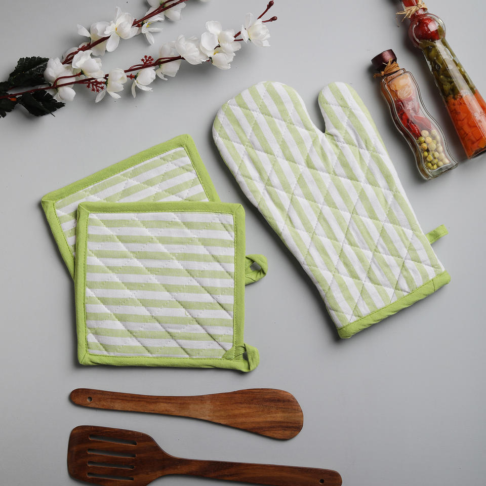 100% Cotton Oven Mitts with Silicone Strip Green Pot Holders for Cooking Microwave Baking Home Food Protection for Restaurants