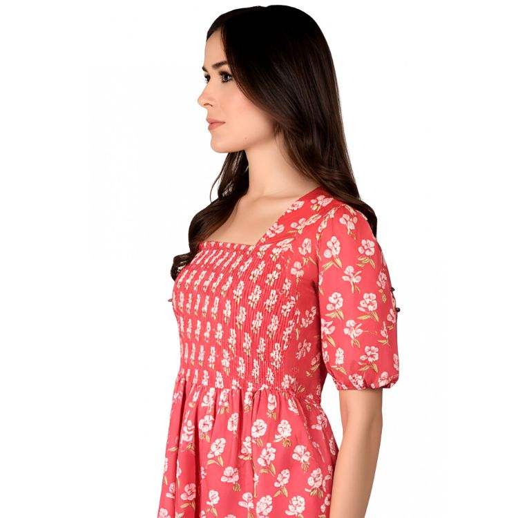 100% Cotton Pink Printed Smocking Dress Women Casual Wear Summer Dress Soft Breathable Fabric Elegant Outfit Washable