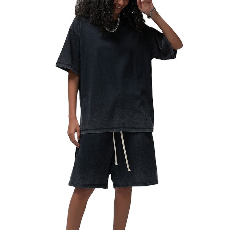 100% Cotton Summer Printed T Shirt & Shorts Set Quick-Drying Solid Color Acid Wash Sun Fade Style for Men Cotton Breathable