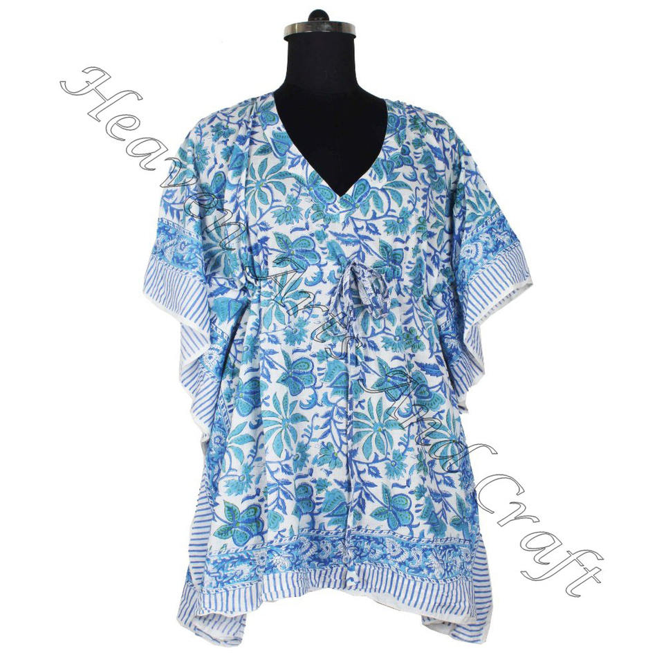 100% Cotton Women Sleepwear Hand Block Printed Kaftan Dress KFCS083 Light Weight Women Casual Occasion Wear Short Caftan Dress