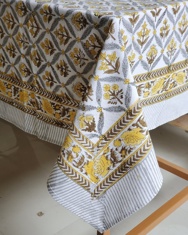 Ridhi 100% Cotton Yellow Block Print Tablecloth with Hand Stamped Rectangle Shaped Table Linen Dining Tablecloth For Sale