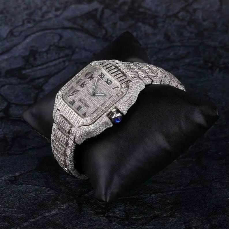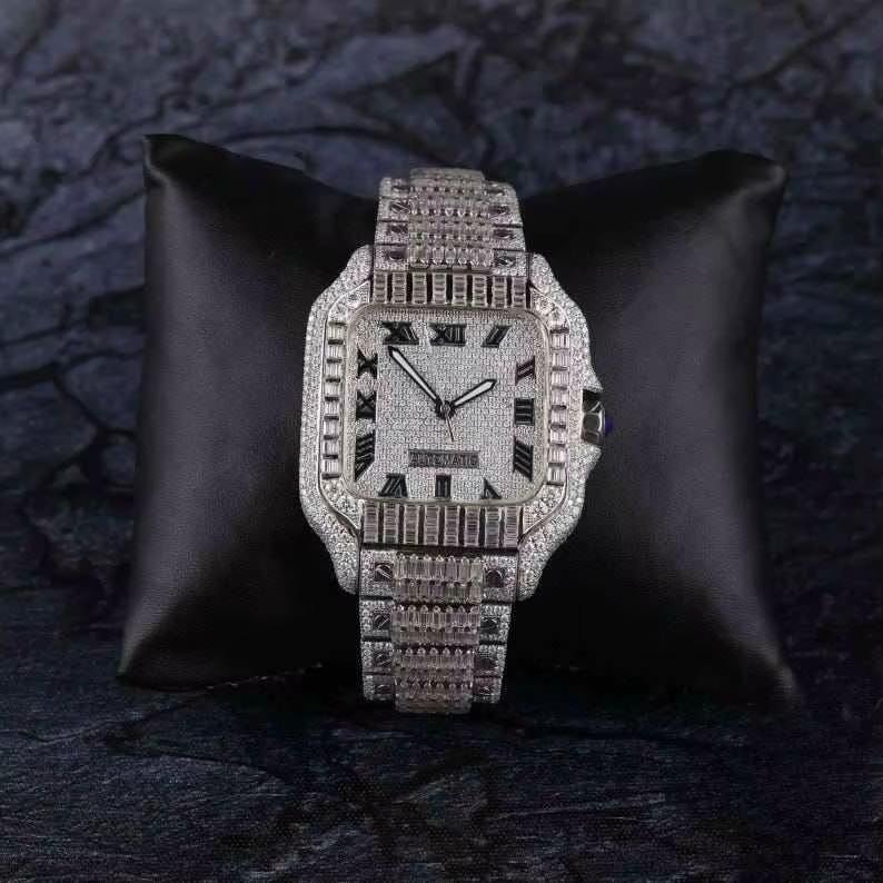 100% Diamond Tested Luxury Shiny Gold VVS Square Moissanite Watch Hip Hop Iced Crystal Stainless Steel Mechanical Watch