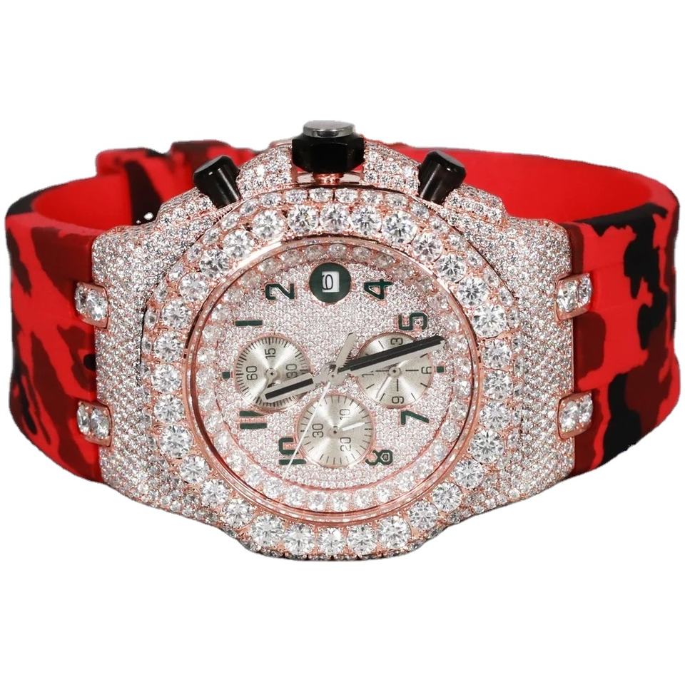 100% Diamond Tested Luxury VVS Moissanite Chronograph Watch Red Camo Strap Hip Hop Crystal Stainless Steel Quartz Waterproof