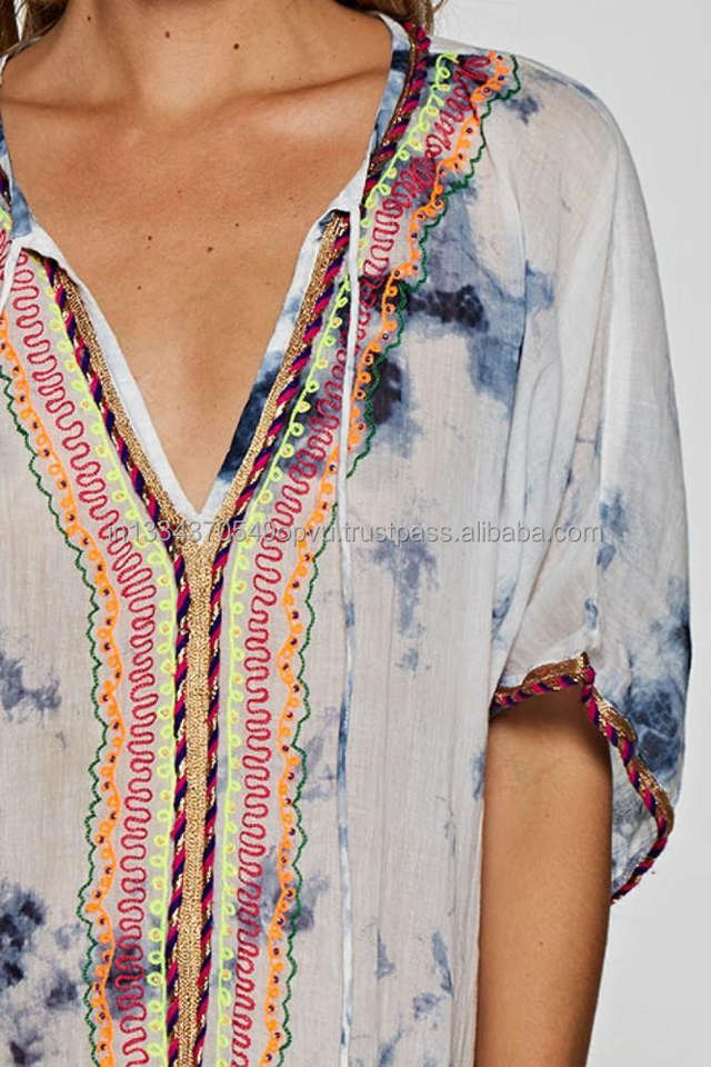 100% Factory Price OEM Service Tie Dye Maxi Length Aari Embroidered Women Kaftan Dress With Multi Color Trim & Neon Tassel Ties