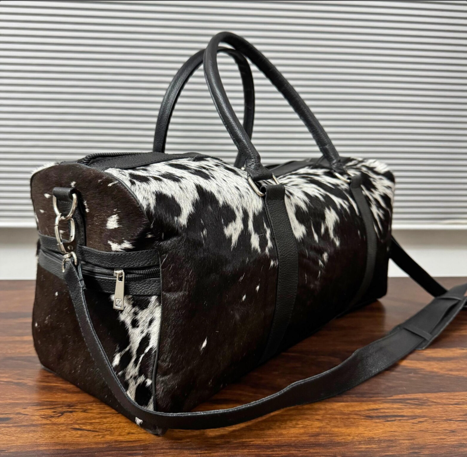 100% GENUINE BLACK & WHITE LEATHER DUFFLE BAG for MEN Luxury Weekender Large Capacity for Travel Sports Gym-Cowhide Hair Style