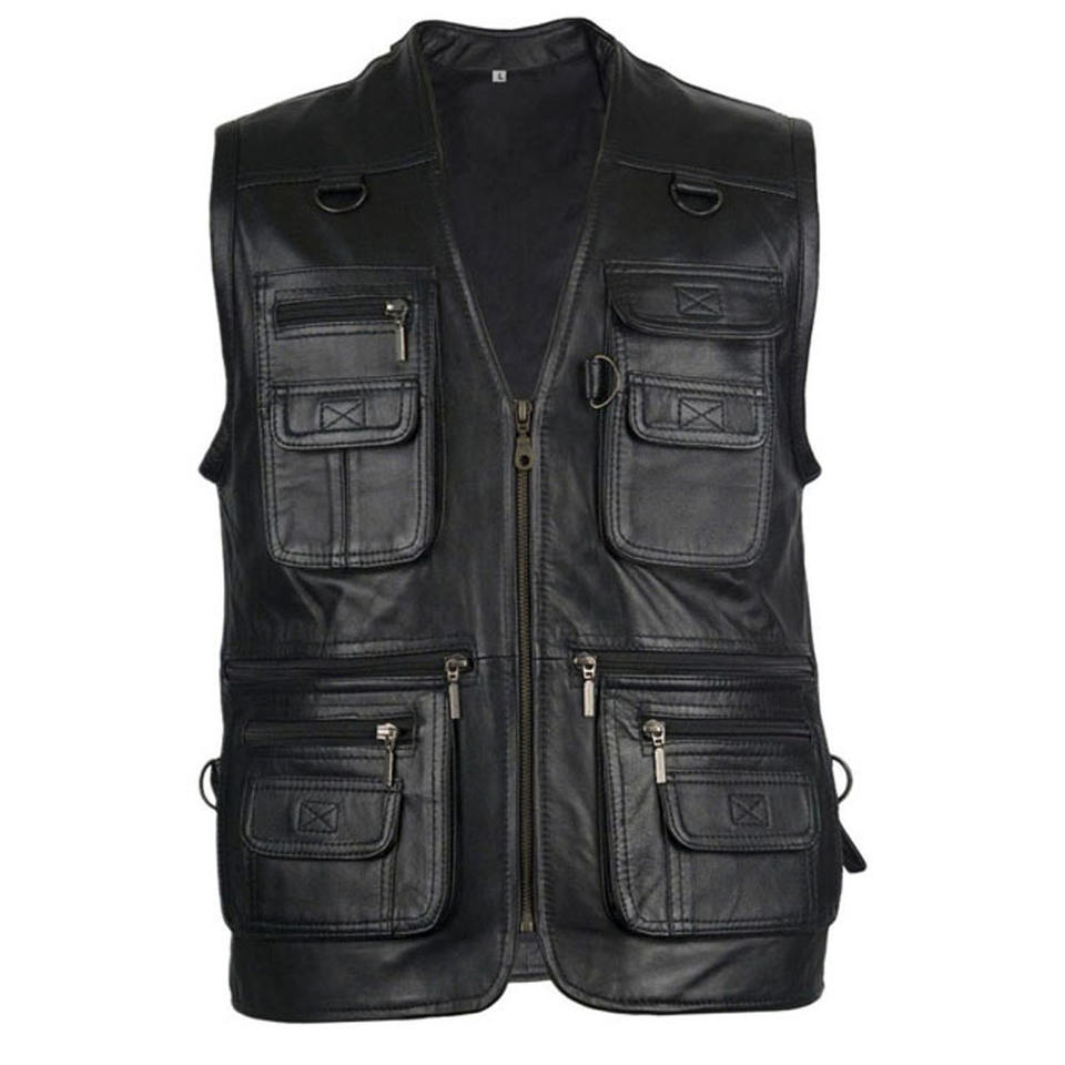 100% Genuine Customized Leather Biker Waistcoat for Men Motorcycle Cut Vest for Winter Hunting Canvas Outer Wear Breathable