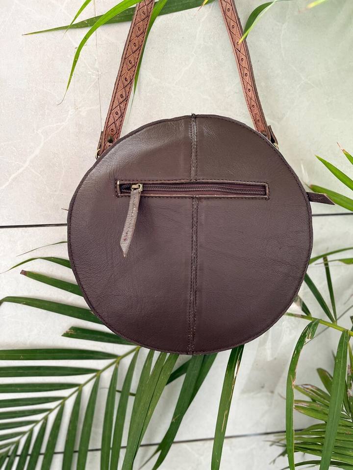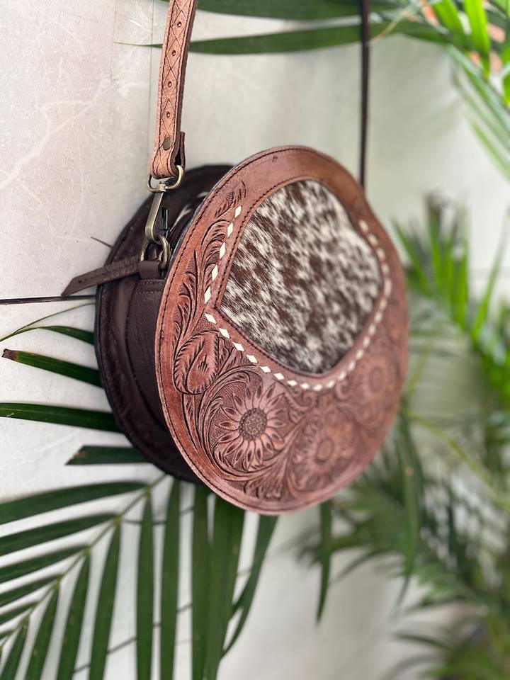 100% Genuine Leather Round Shaped Cross-Body Bag Tassel Hand Tooling Florals Carved Concealed Carry Hair On Cross-Body Sling Bag