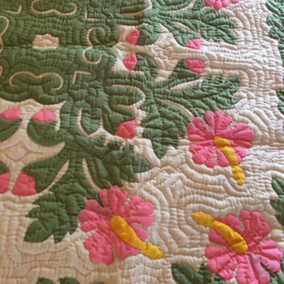 100% Hand Embroidered Hawaiian Quilts Pink Hibiscus Green Baby Blanket Handwoven Quilts with Intricate Embroidery Wholesale
