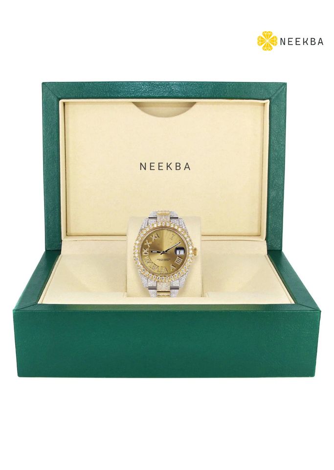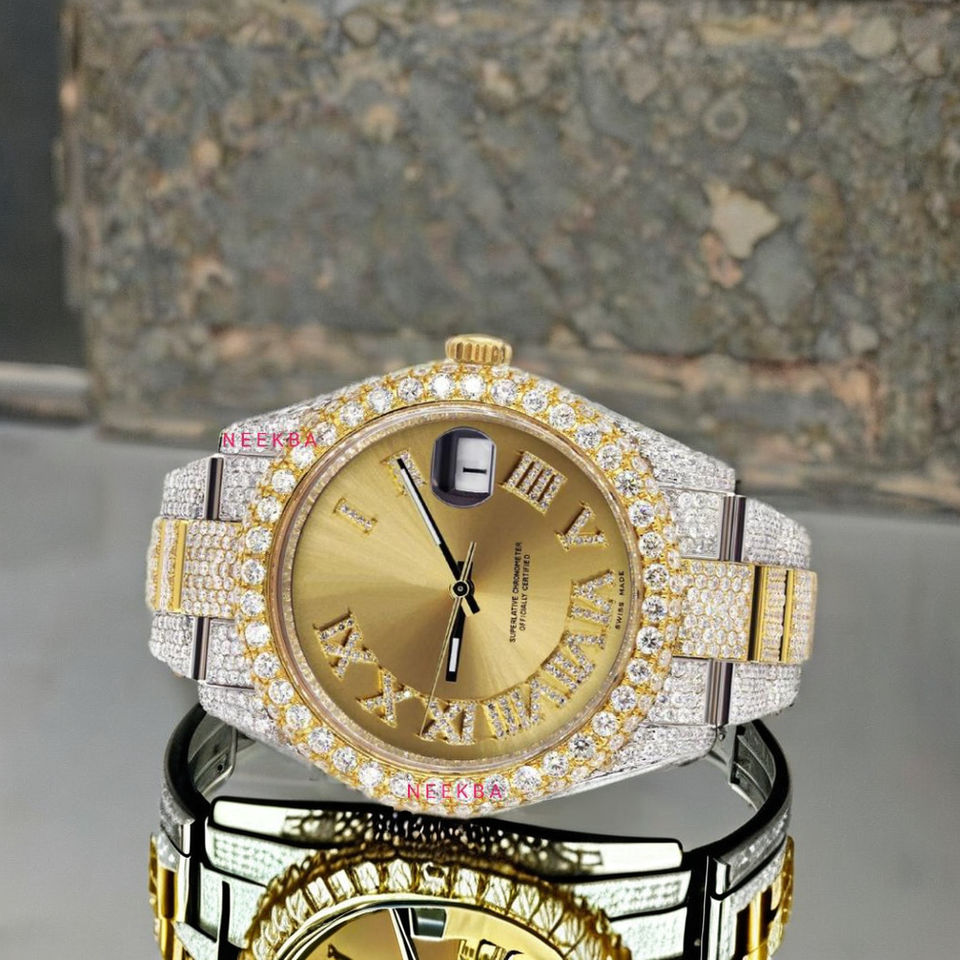 100% Hand-Set Moissanite Watch with Roman Numerals & Sunburst Dial, Hip Hop Style Bust Down Moissanite Analog Watch from India