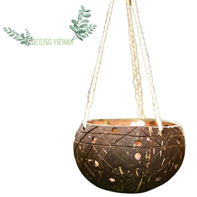 100% Handicraft and Eco-Friendly Coconut Shell Plant Pot/ Coconut Planter Pot With Hanging Rope Made in Vietnam