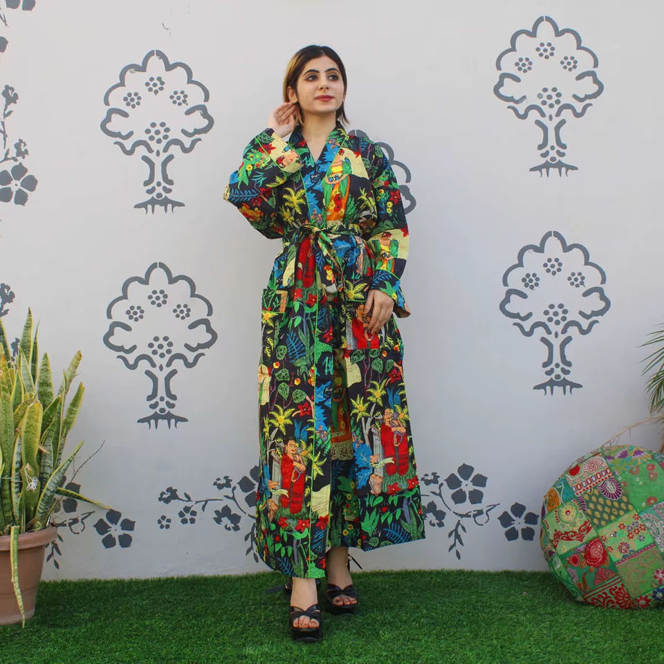 100% Indian Handcrafted Cotton Kimono Dress Floral Heritage Boho Pattern Slit Waist Tie Pockets Screen Printed Casual Kimono