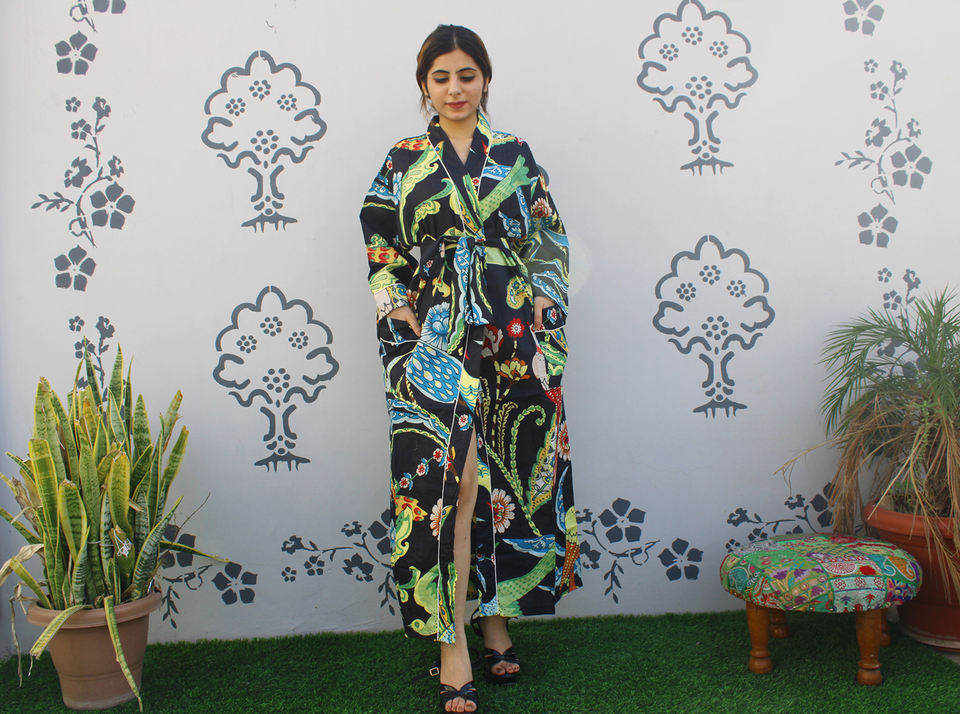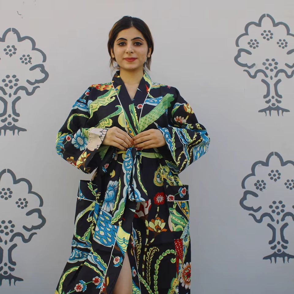 100% Indian Handcrafted Cotton Kimono Dress Floral Heritage Boho Pattern Slit Waist Tie Pockets Screen Printed Casual Kimono
