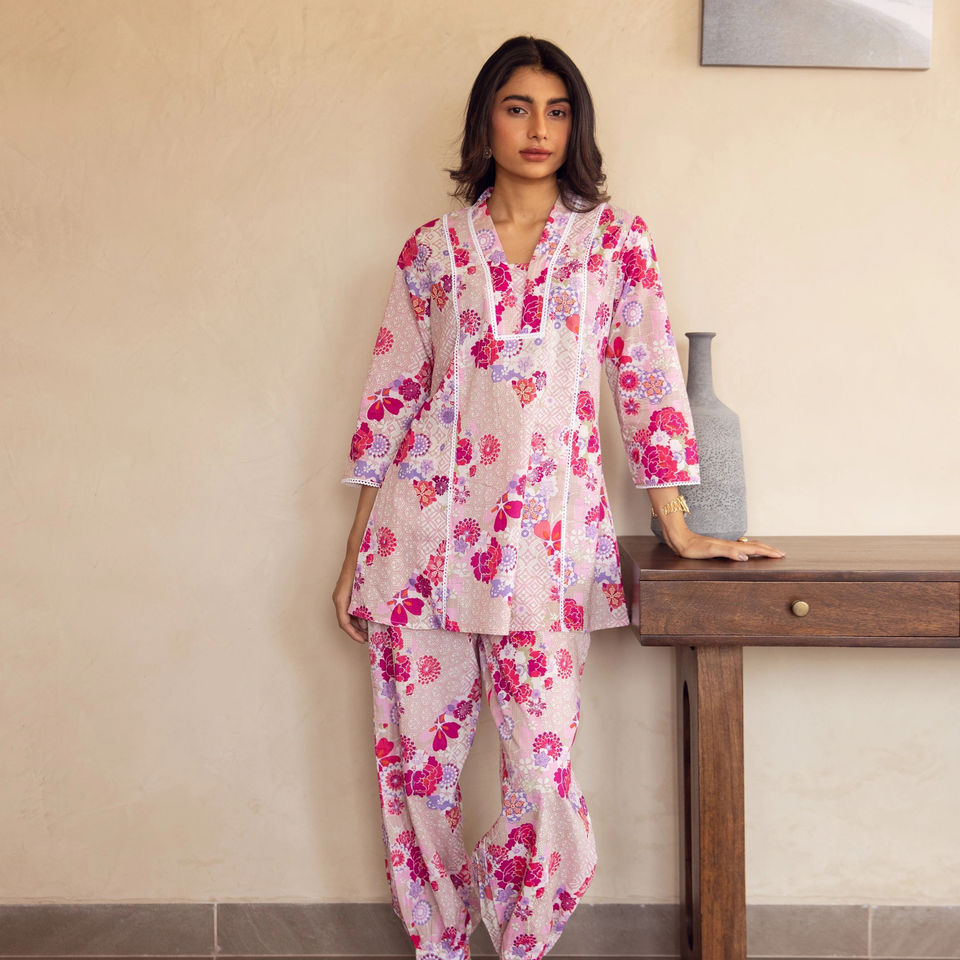 100% Indian Pink Cotton Petal Co Ord Set With Pockets 3/4 sleeve viscose shirt and Pant Co- Ord Set At Factory Price