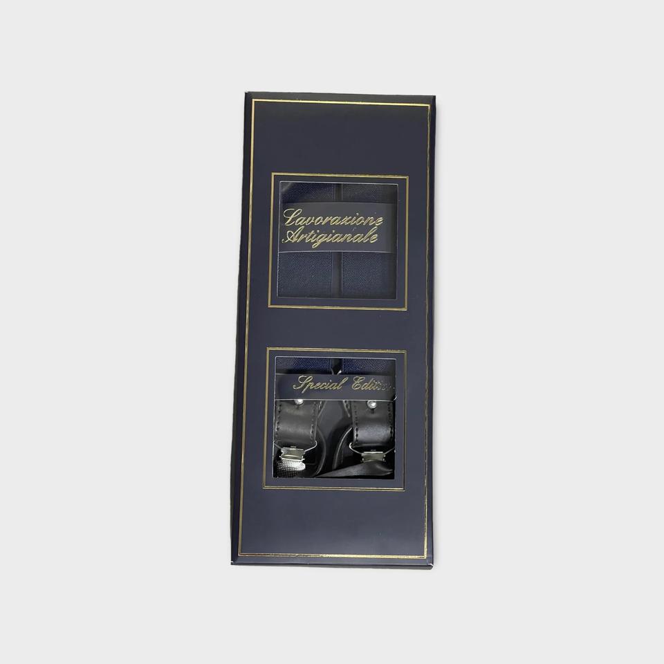100% Italian Crafts Men Navy Blue Elastic Leather Suspenders Custom Size Metal Clip Elegant Gift Box Adjustable Braces