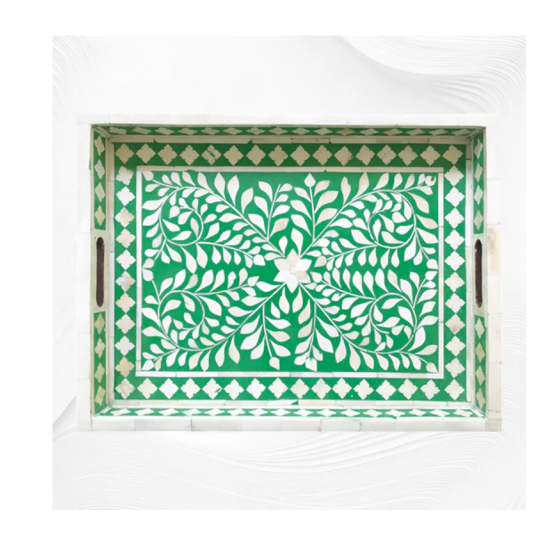 100% Natural Bone Inlay Serving Tray Indian Green White Color Square Floral Design Dishwasher Safe Tray
