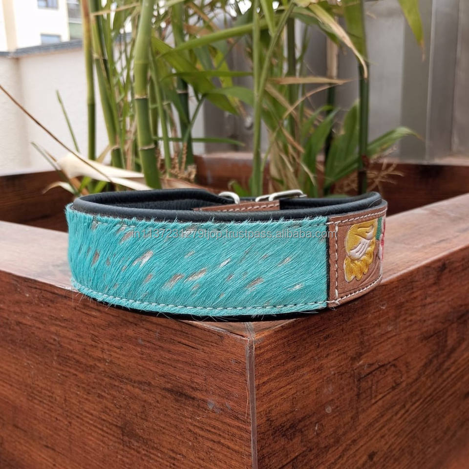 100% Natural Hair on Metallic Cowhide Branded Dog Collar Hand Tooled Western Padded Collar Engraved Genuine Leather Pet Collar