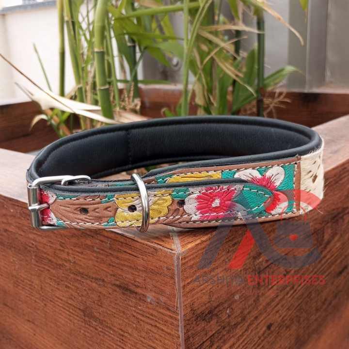 100% Natural Hair on Metallic Cowhide Branded Dog Collar Hand Tooled Western Padded Collar Engraved Genuine Leather Pet Collar