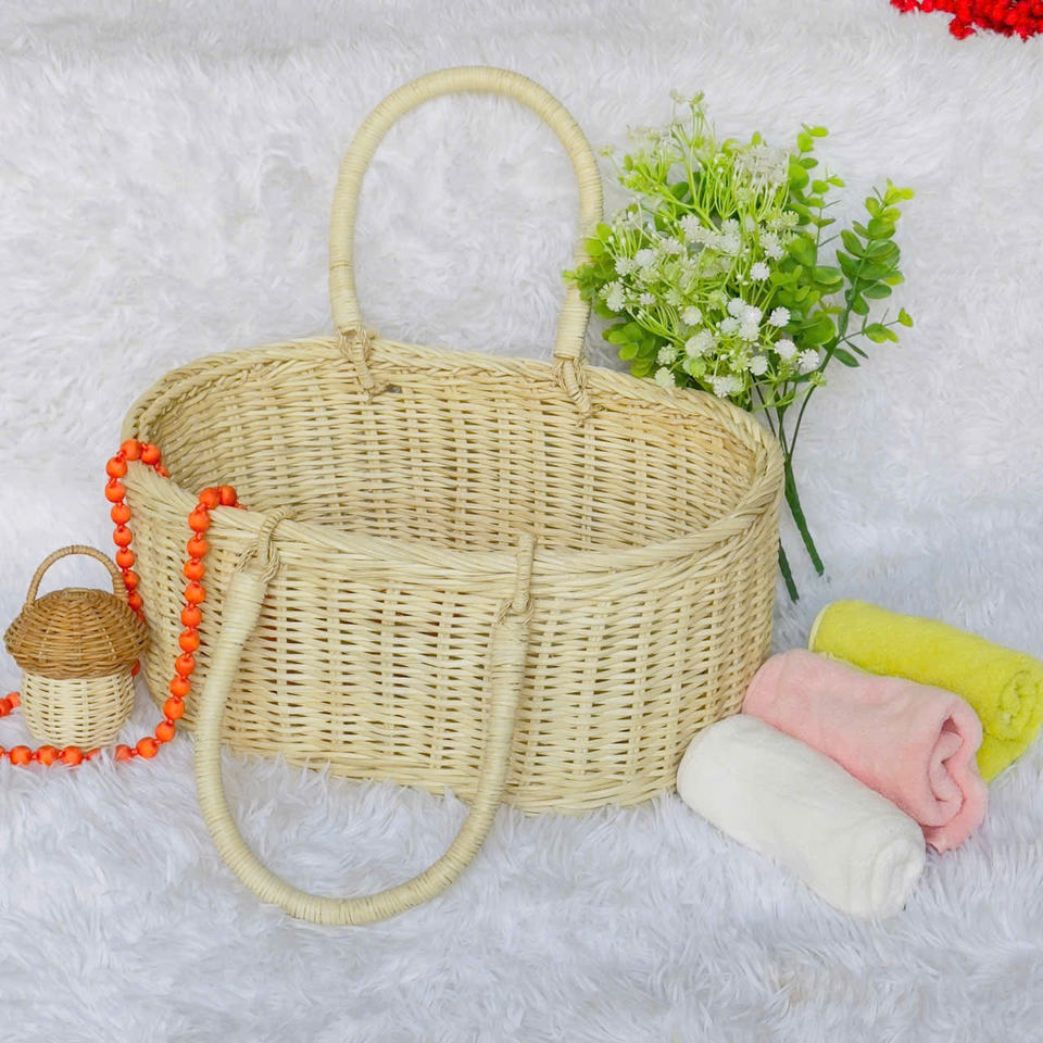 100% Natural Handmade Rattan Tote Bag Floral Patterned Scollap Diaper Bag and Nursery Basket Made in Vietnam