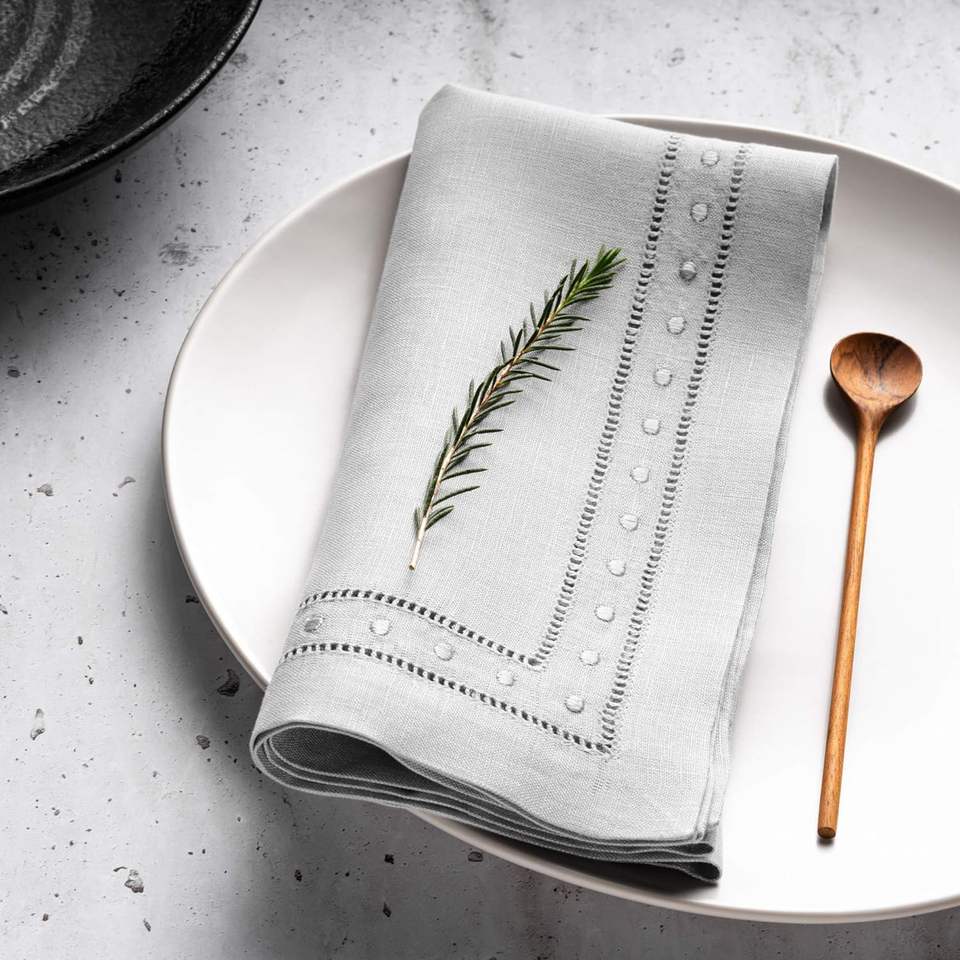 100% Natural Organic Linen Tea Napkins Fine Dining Table Embroidered Swiss Dots Double Hemstitched Customizable Napkins Weddings