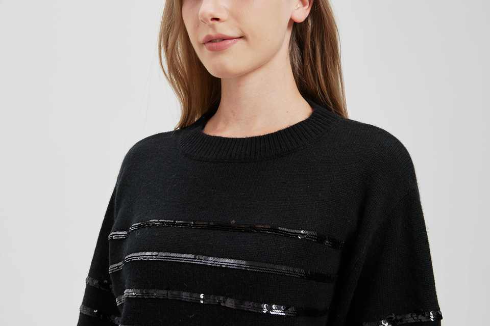 100% Pure Cashmere Ladies' crew neck long sleeve knitting pullover sweater with black sequins