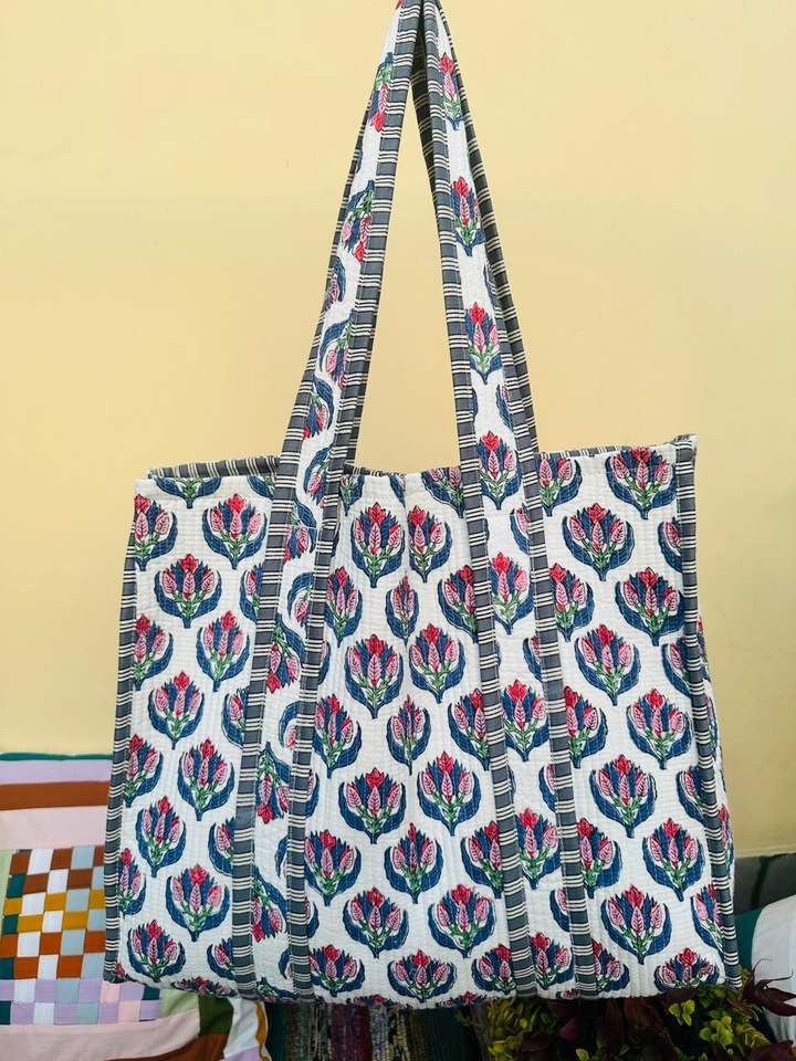 100% Pure Cotton Summer Floral Small Tote Bag for Women with Zipper Closure Indian Quilted Design Grocery Organizer