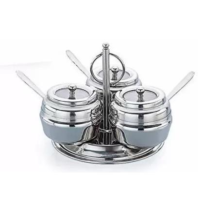 100% Real Stainless Steel Salt and Sugar Bowl Best Quality with Lid and Spoon with Stand for Masala/salt/sugar/coffee 3 Bowl