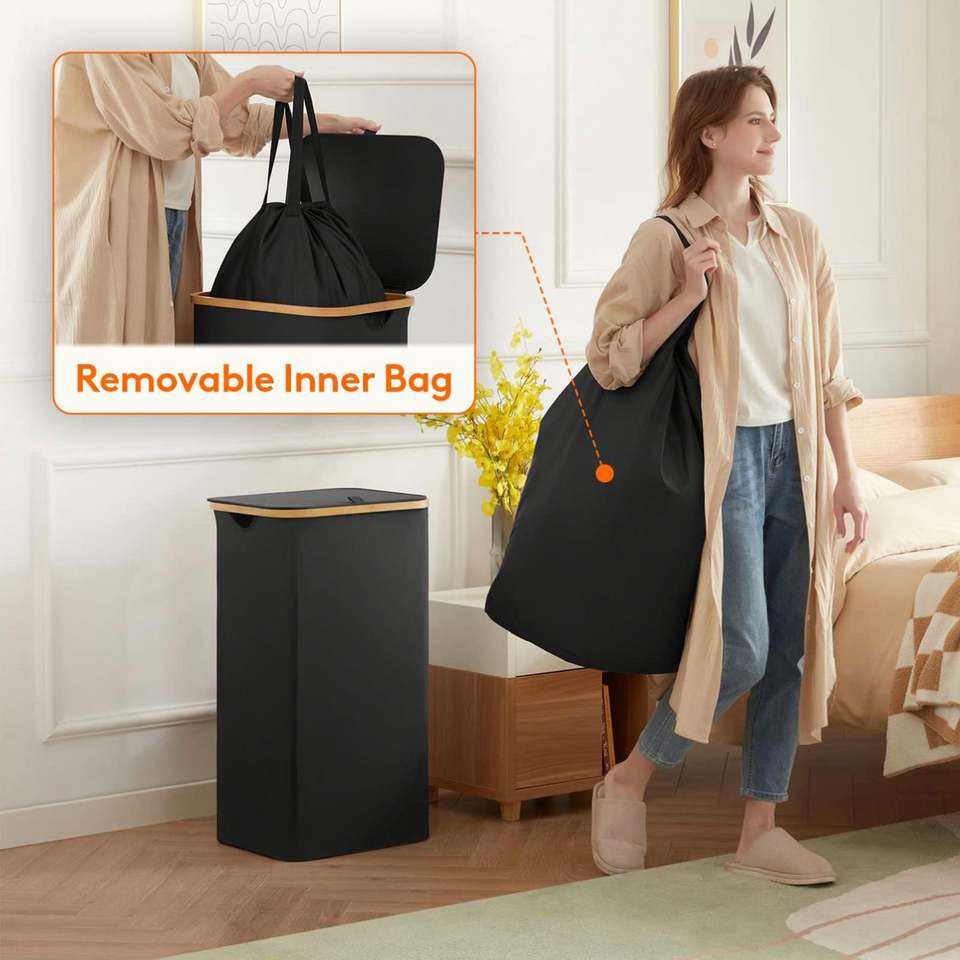 100L Laundry Basket with Lid Foldable Clothes Hampers with Bamboo Handles and a Removable Laundry Bag